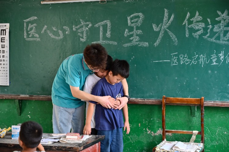 除了用眼衛生,海姆立克急救法的科普也是活動的重點之一。小朋友們年齡尚小,在日常生活中可能會面臨異物卡喉等緊急情況,服務團的同學們通過模擬演示,闡述操作細節,手把手地指導小朋友們,并為表現出色的小朋友給予小禮品以資鼓勵,教導他們在關鍵時刻要冷靜地運用海姆立克急救法解救有需要的人。普及這種實用的急救技能不僅改善了鄉村醫療急救知識匱乏的問題,也為小朋友們的生命安全增添了一份有力的保障。