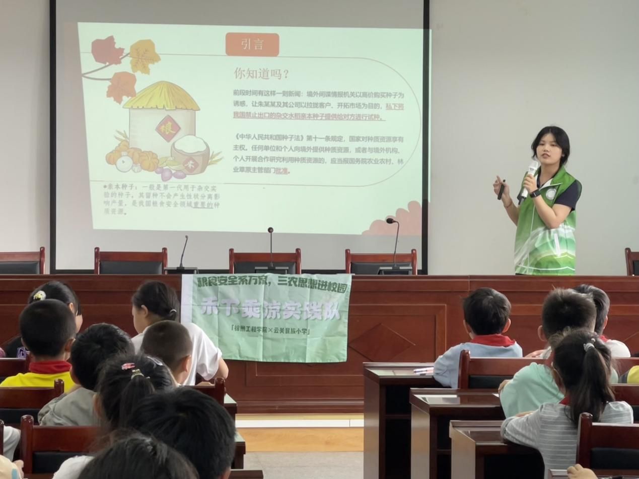 7月15日上午,隨著陽光的灑落,云關民族小學的校園里迎來了一群朝氣蓬勃的大學生。她們手持宣傳資料,面帶微笑,準備為小學生們帶來一場生動的糧食安全知識課。此次活動由徐州工程學院暑期社會實踐團隊精心組織,旨在通過大學生與小學生的互動,讓糧食安全觀念深入童心。