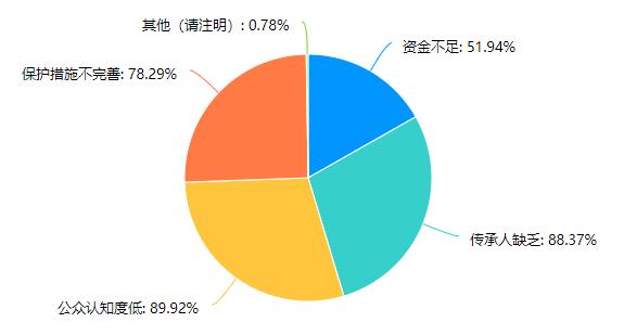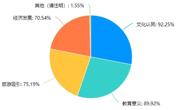 分析結論:根據數據表格顯示,對于保護非物質文化遺產的重要性,絕大多數受訪者(73.64%)認為是“非常重要”,其次是認為是“重要”的受訪者(22.48%)。僅有少數受訪者認為是“一般”(2.33%)或“完全不重要”(1.55%)。在本次調查中,沒有受訪者認為保護非物質文化遺產“不太重要”。綜合來看,保護非物質文化遺產被認為是受訪者們普遍認可的重要任務。