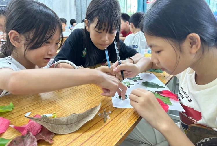 美育——“萬里藍天白云游,綠野繁花無盡頭。”實踐團成員們設計了自然探索課程,帶領孩子們外出觀察并采集葉子帶回,完成了一幅幅富有創造力的葉子拼貼畫,讓孩子們在了解葉片結構的同時,也提升了動手能力。