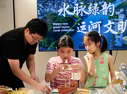 活動伊始,志愿者向社區青少年介紹了運河的文化和生態保護的意義,并強調了運河文化傳承保護中舟楫的重要性。隨后,講解了船的組成構造,以及制作模型的要點。在志愿者們的指導下,小朋友們分組分析圖紙、拼裝模型,一步步耐心地制作屬于自己團隊的船舶模型。從剪裁、安裝到固定、粘合,每一個步驟都傾注著青少年們對運河生態保護的決心和對運河歷史文化遺產的傳承。