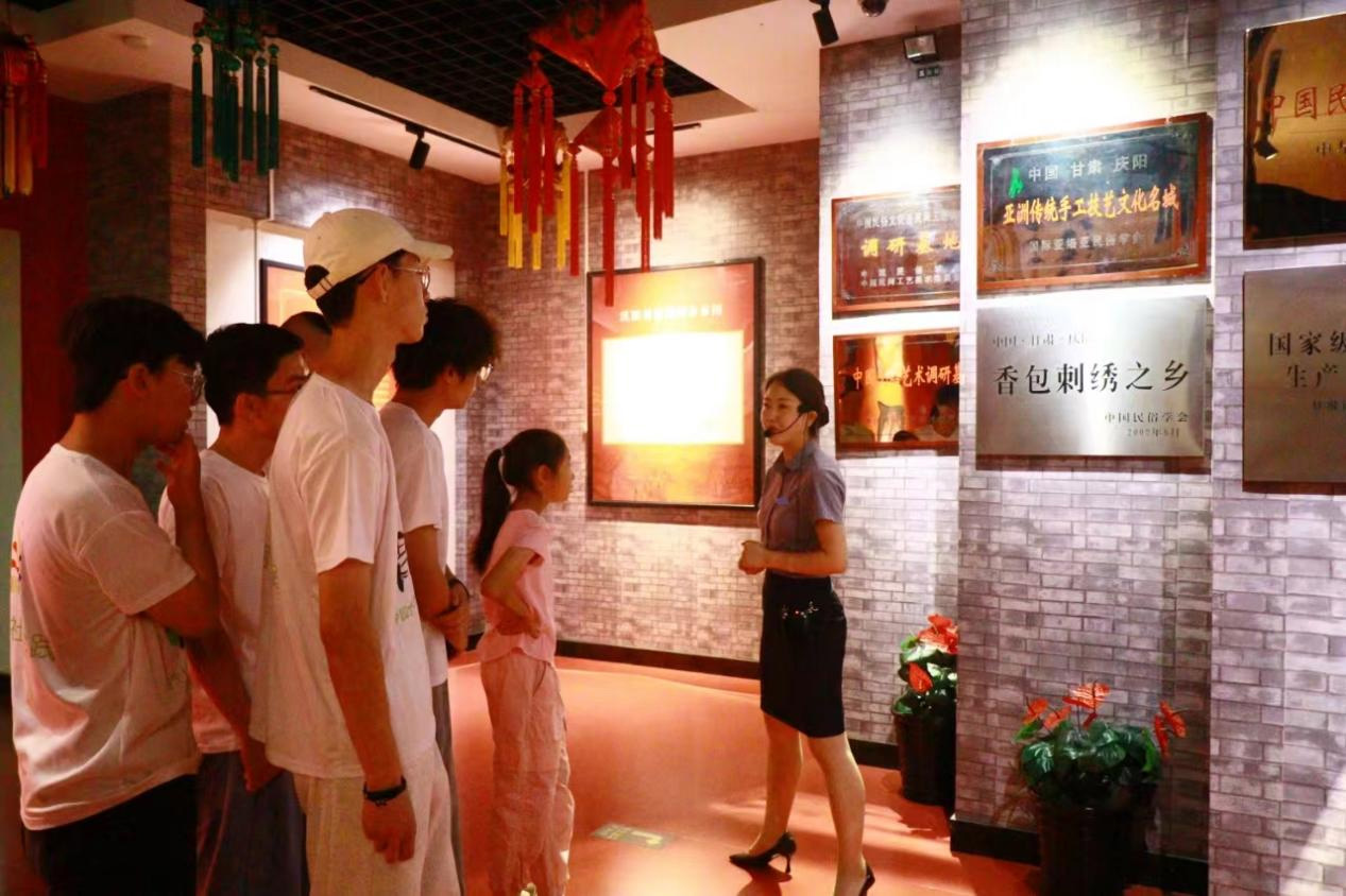 作為此次三下鄉實踐活動的首站,實踐隊伍于7月17日到達了慶陽市博物館。該博物館共設九個展廳,在講解員趙老師的帶領下,實踐隊依次參觀了慶陽歷史文物展、慶陽香包展、慶陽剪紙展,他們了解到慶陽剪紙源于農耕文化,體現了農民深厚的自然崇拜;慶陽香包可以追溯到2300年前,岐伯經常攜一藥袋防疫驅瘟、禁蛇毒,并開創“熏蒸法”。岐伯乃慶陽人士,隨身佩戴香草藥在當地逐漸成為習俗,流傳至今。在香包展廳,團隊重點了解了我國現存最古老的刺繡品之一——千歲香包。展柜中陳列的千歲香包帶鏈上穿有瑪瑙寶石,主體的圖案則是彩色絲線繡制的海棠花,底部有寫意的鳳爪紋飾,整個造型從色彩到形態層次分明。相傳它作為佛教信徒心中的珍寶來獻給佛祖,表示敬仰及祈禱祝福的誠意。實地調研中,團隊成員深入了解了慶陽香包和剪紙的歷史、種類和制作工藝,為古人的智慧所折服,也深刻的體會到了從古至今人們對于美好生活的向往。博物館之行,讓人難以忘記的一幕是在講解員趙老師講解的同時,一位小女孩游客也與隊員們同行,加入到隊伍當中,認真聽講解員的講解,看到小女孩被慶陽剪紙香包的非遺技術所吸引,也讓實踐隊員認識到香包剪紙的歷史研究價值。