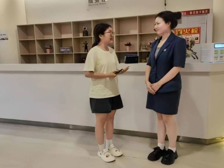 圖為實踐隊員與浴場工作人員交流。中國青年網通訊員 蓋藝蔚 供圖