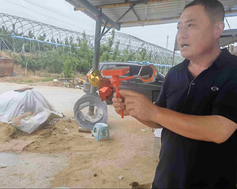 隨后,書記帶領成員來到了當地的櫻桃園進行實地考察,仔細講解了櫻桃園的生產管理過程、殺菌滅蟲的注意事項、銷售模式及生產規模等。孫國民更詳細的為實踐隊介紹并示范使用了村子里各種用以提高產能技術、工具,例如依托當地水庫之多而運用的滴灌技術、防飛鳥的警示儀器等。孫書記滔滔不絕的熱情介紹,不僅讓成員們感嘆果業發展的艱辛不易,也讓成員們深深感受到了書記為鄉村振興,產業發展所做出的努力與貢獻。