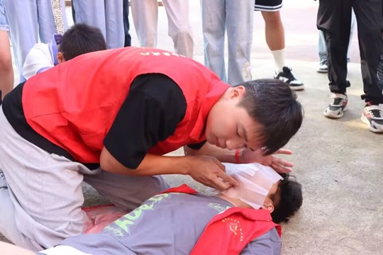 在包扎教學(xué)環(huán)節(jié)中,志愿者們展示了不同部位傷口的包扎方法,如頭部和手臂包扎技巧。學(xué)生們在志愿者的指導(dǎo)下,親自動手操作,通過實踐加深了對包扎技能的理解和掌握。他們認(rèn)真細(xì)致地為模擬傷口進行包扎,體驗到了急救工作的嚴(yán)謹(jǐn)與細(xì)致。