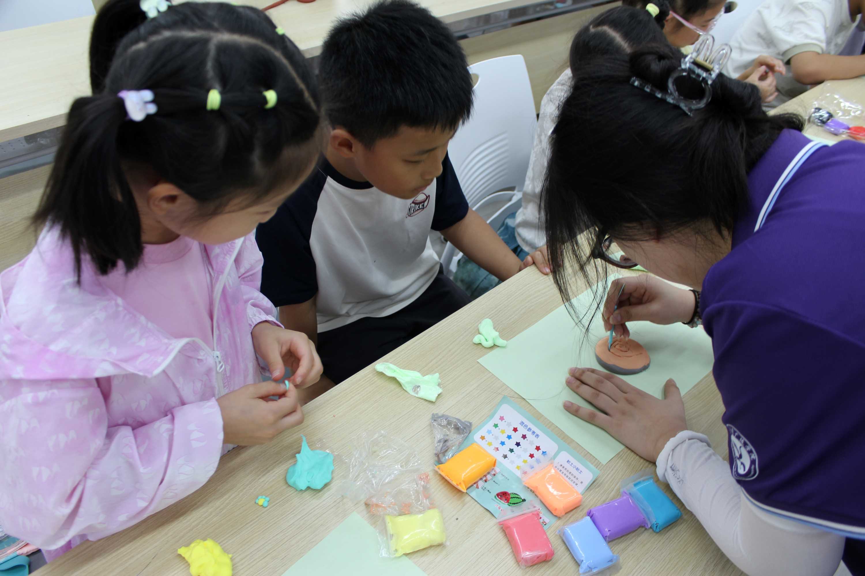 圖為實踐團隊成員與小朋友一起做黏土螺旋花園。 梁英杰 供圖