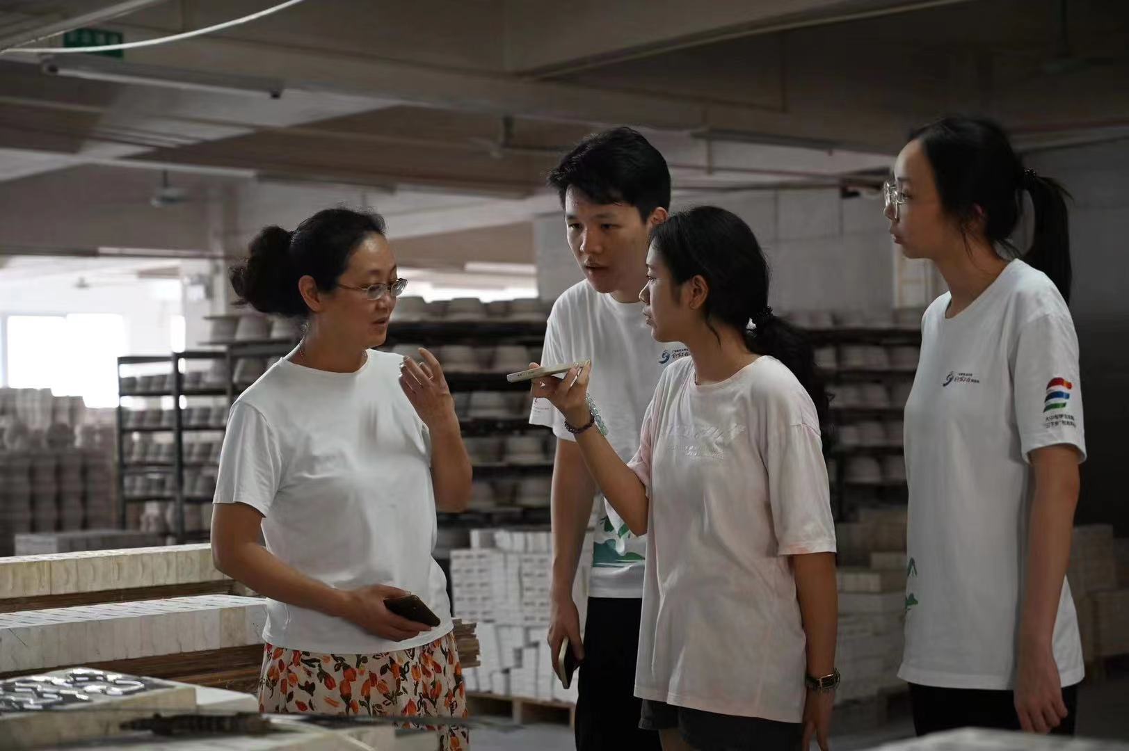 進行實踐前,廣東財經大學樂“瓷”不疲暑期調研團隊首先來到潮州市楓溪鎮人民政府共青團辦公室,就如何更好傳承發揚陶瓷非遺文化進行了交流座談。潮安區楓溪鎮共青團團委書記陳婉臻、共青團團委老師蔡湘涵熱情接待了實踐突擊隊,并就團隊的疑問以及楓溪鎮陶瓷文化發展的實際情況進行全面的講解,同時為實踐團提供了實地采訪楓溪鎮當地陶瓷非遺傳承人的機會。陳婉臻書記介紹到:“楓溪鎮陶瓷是與眾不同的!是在其他地方所看不到的”,體現出潮州楓溪鎮作為中國陶瓷一重要窗口,是有著深厚歷史文化底蘊,是將優秀傳統文化、工匠精神、潮州文化、潮州特色不斷創新融合,構建打造潮州陶瓷多元發展,不斷將非遺文化發揚走進大眾視野。實踐團還向楓溪鎮團委表達出致力于打造一個有關與楓溪鎮陶瓷文化的宣傳片以及有關陶瓷文化IP的文創產品等。