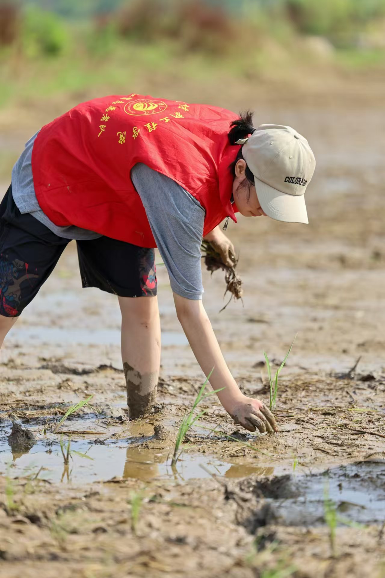 圖為志愿隊成員正實踐插秧。王禹同 供圖 在稻田的另一邊,農戶們運秧、托秧、上秧,農機手熟練地操作著插秧機,一塊塊水田間,農機作業聲轟鳴,來回穿梭,一株株秧苗從插秧機苗盤上依次滑落,均勻整齊地植入水田里,為稻田披上綠裝,短短20分鐘,原本空曠的稻田就換上了嶄新的“綠裝”。在插秧機的助力下,水稻種植的效率大大提升,節省了人力、時間成本。