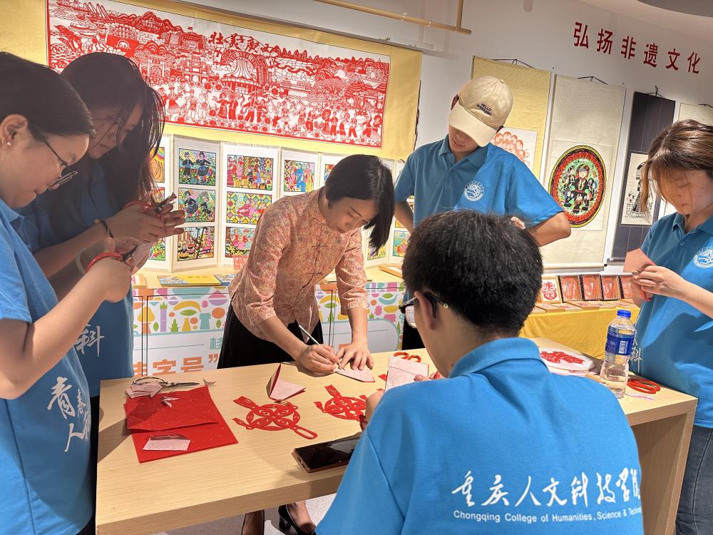 (圖為鐘老師指導(dǎo)實(shí)踐團(tuán)成員剪紙創(chuàng)作)
