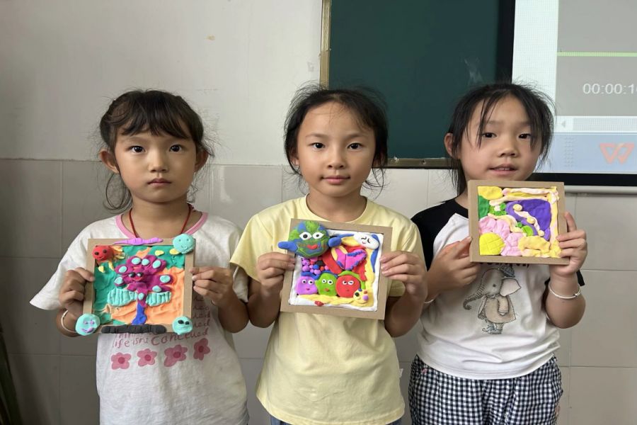 (圖為小朋友們粘土手工課結束后的成果展示,小朋友們通過自己豐富的想象創作出了各色各樣的作品,在課程結束后,志愿者們給小朋友們拍照留念 韓語涵/提供)