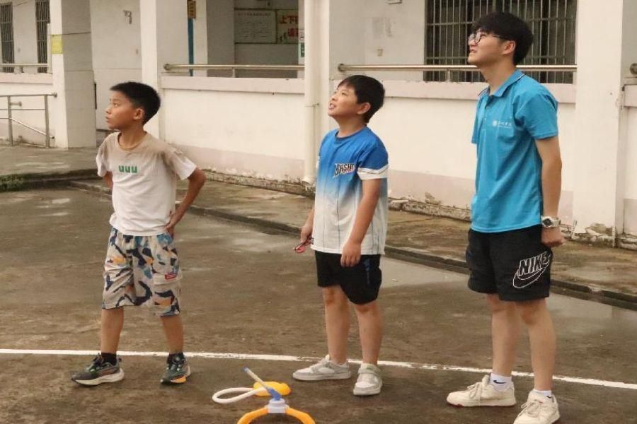 (圖為科學探索課程上,小朋友們與志愿者們一同進行操作小火箭,小朋友們充滿興趣,度過了一堂充滿歡聲笑語的課程 韓語涵/提供)