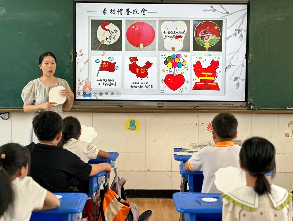 團隊成員岳蘇瓊同學通過給學生們講述了扇子發展的歷史淵源和扇子的文化意義,對蘇扇這一具有蘇州特色的名扇進行了詳細的介紹。在理論講解的基礎上,給同學們發放空白的扇面,扇柄,顏料以及繪筆,讓孩子們以愛國主義主題在扇面上自由發揮。