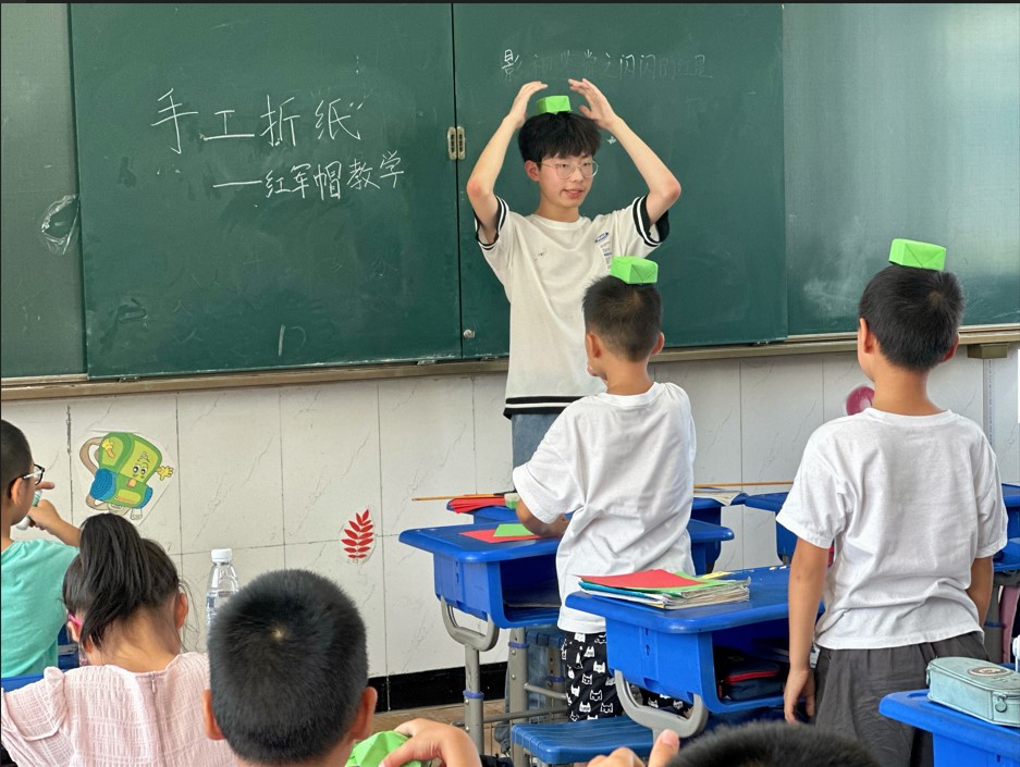 團隊成員舒振煒同學將折紙工藝與革命文化相結合,通過講述紅軍長征故事引起學生興趣,帶領同學們制作紅軍帽。小小的紙質紅軍帽代表了新時代的孩子們對于紅軍革命文化的敬仰,讓孩子們體會到紅軍們的不怕艱苦,進而傳遞了愛國主義思想,堅定了他們未來報效國家的理想信念。