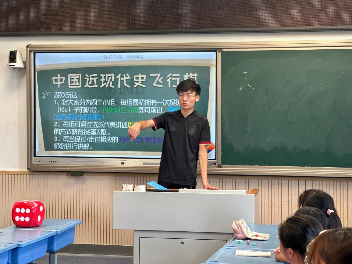 團隊成員潘甲申同學將愛國主義歷史與飛行棋游戲相結合,利用分布著許多中國近現代史上愛國人物的特制棋盤,游戲啟發式的進行歷史知識的學習。小朋友們通過表演才藝或者講述歷史故事獲得擲骰子機會,以此在棋盤上前進抵達“終點”。當棋子落在有著愛國人物名字的節點上時,潘甲申同學為孩子們進行講解并啟發式教育學生。