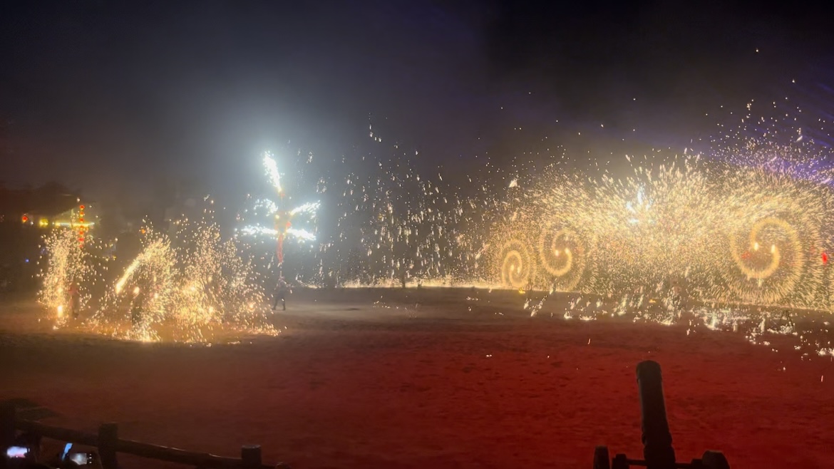 伴隨著一聲象鳴,打鐵花表演正式開始,一場時代與打鐵花的故事驟然開幕。整個表演以火為筆,以鐵為墨,在熾熱的爐火中勾勒出農具的堅韌與兵器的鋒芒,讓游客們仿佛穿越時空,親眼見證了那一段段輝煌的歷史瞬間。再現了古代社會人們采集鐵礦石、冶煉鐵器的場景,遠古時代到鐵器時代的風土人情在音樂和光影中重現。
