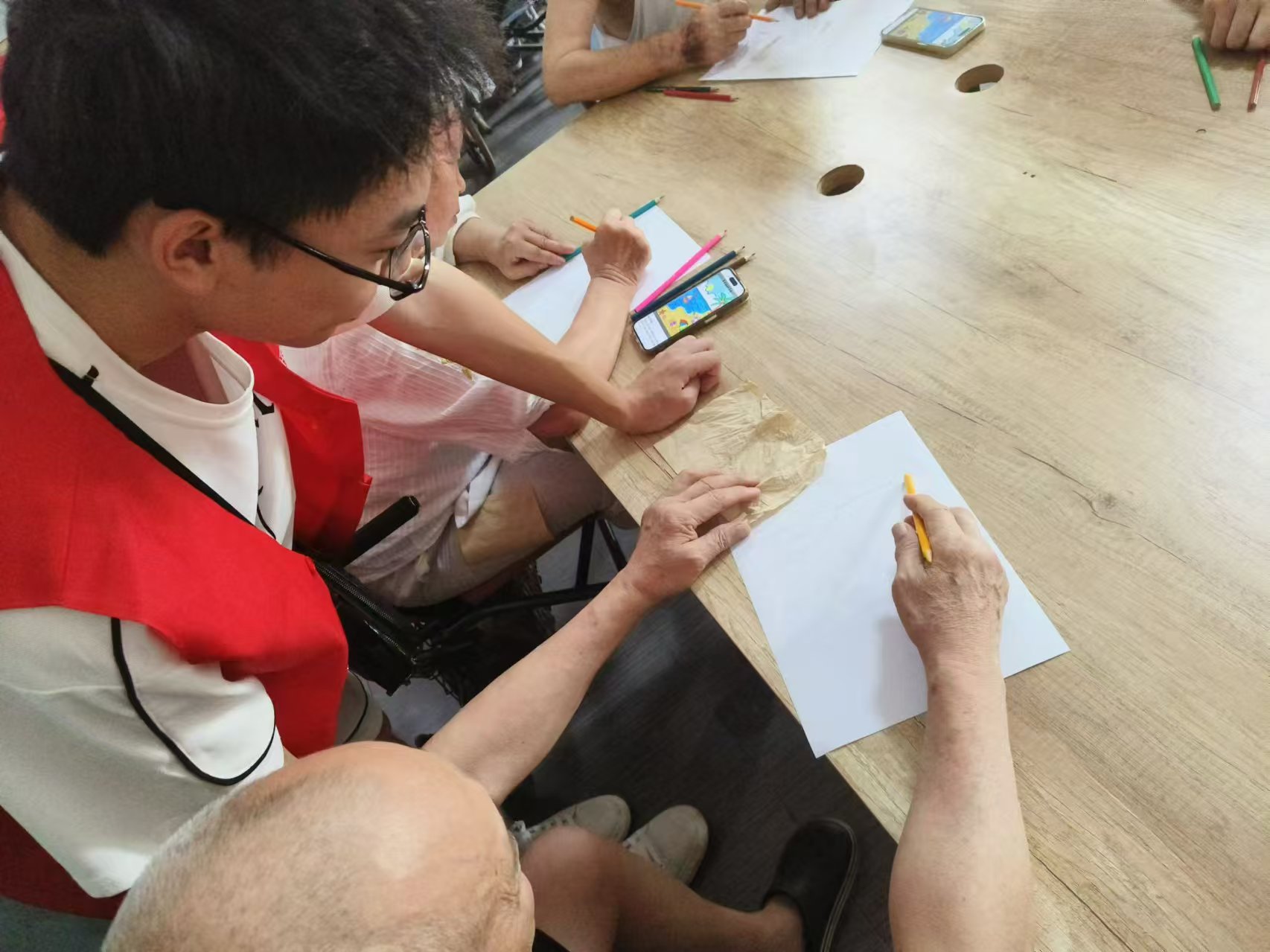 圖為團(tuán)隊(duì)成員幫助老人完成繪畫。 李彩霞 攝