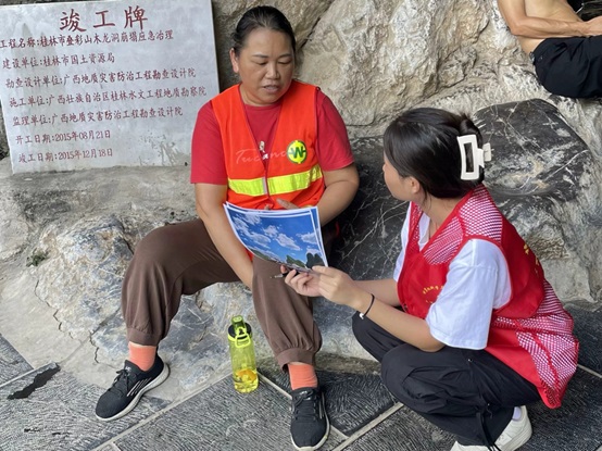 圖為實踐隊隊員向市民宣講漓江水域治理的方針。楊嘉琪 供圖