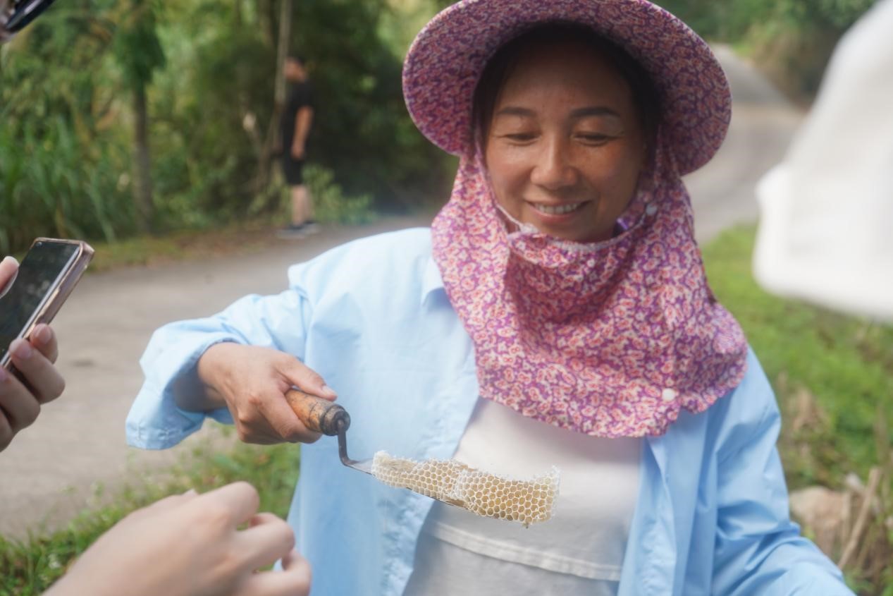 圖為實踐隊員接過蜂農鏟下來的蜂蜜。 楊雨萱 供圖