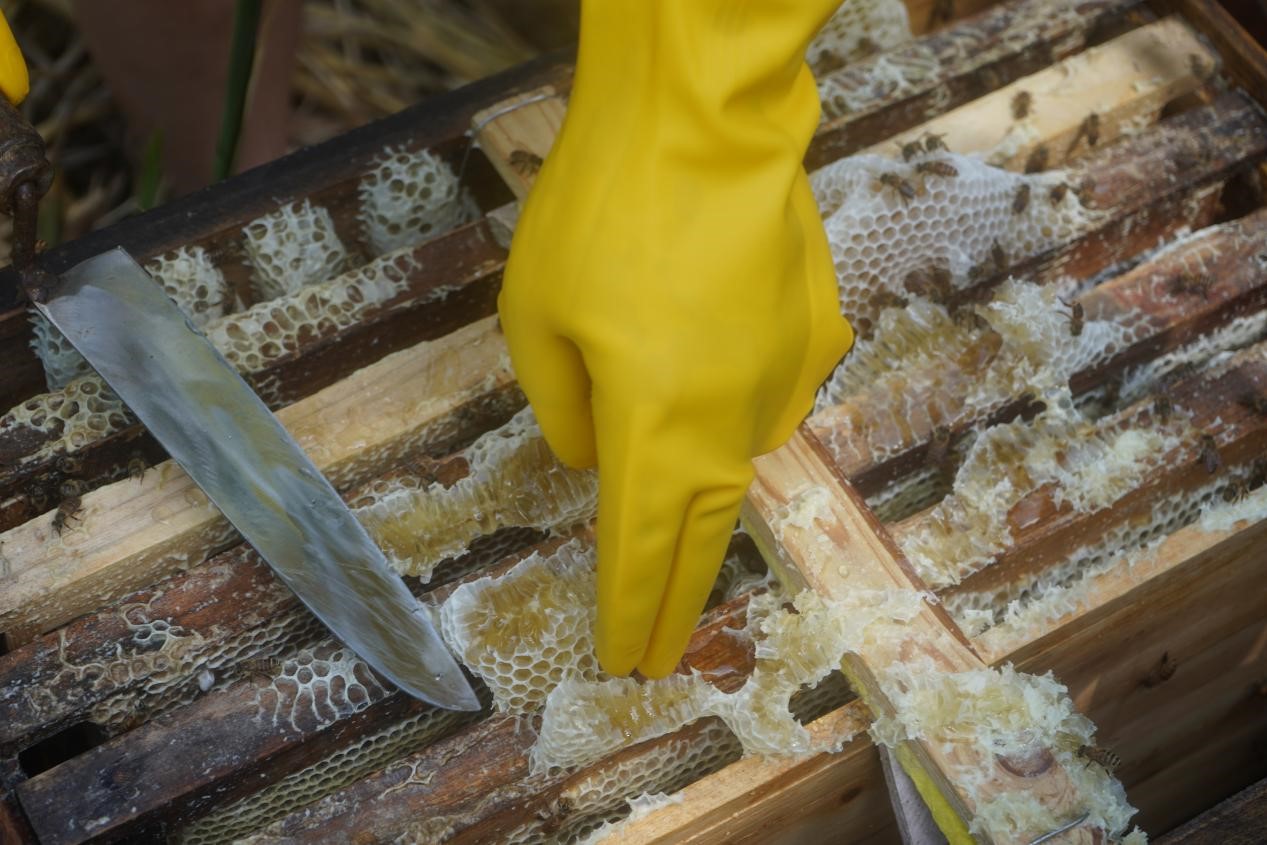 圖為蜂農將蜂巢中的蜜割下來。 楊雨萱 供圖