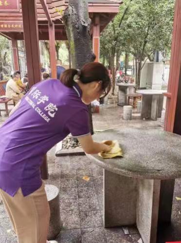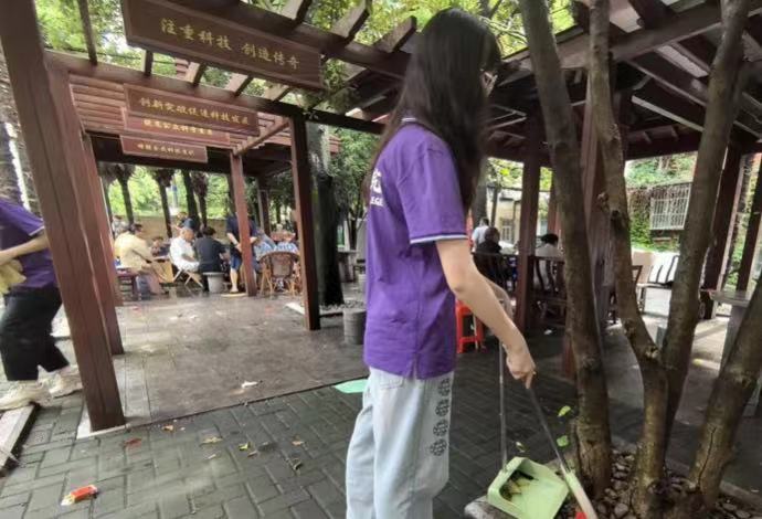 從7月19日開始,志愿者們分組進入社區(qū),與老人們進行親密的接觸和交流。他們不僅為老人們提供日常生活上的幫助,如陪伴聊天、整理房間等,還幫助打掃社區(qū)衛(wèi)生。比如清掃下水口的積葉,擦干社區(qū)公共桌椅上的積水,處理角落的塑料袋等。