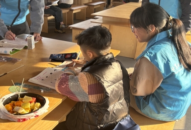 下午,陽光透過會客廳書院寬敞的木質窗戶,灑下一片金黃。瑞昇歸雁實踐團的成員們身著紅色志愿者服,為大吳村的孩子們輔導功課。志愿者們耐心解答問題,用生動的方式講解知識,激發孩子們的學習興趣。孩子們眼神中閃爍著求知的渴望,與志愿者們一同沉浸在知識的海洋。書院窗外綠樹成蔭,遠處樓房若隱若現,為寧靜的學習空間增添生活氣息;屋內,木質桌椅散發淡淡木香,營造出溫馨的氛圍。在這個充滿愛的地方,瑞昇歸雁實踐團用行動播種知識的種子,傳遞愛心的暖流,為大吳村的孩子們點亮知識的明燈,也為古樸的村莊注入新的活力。