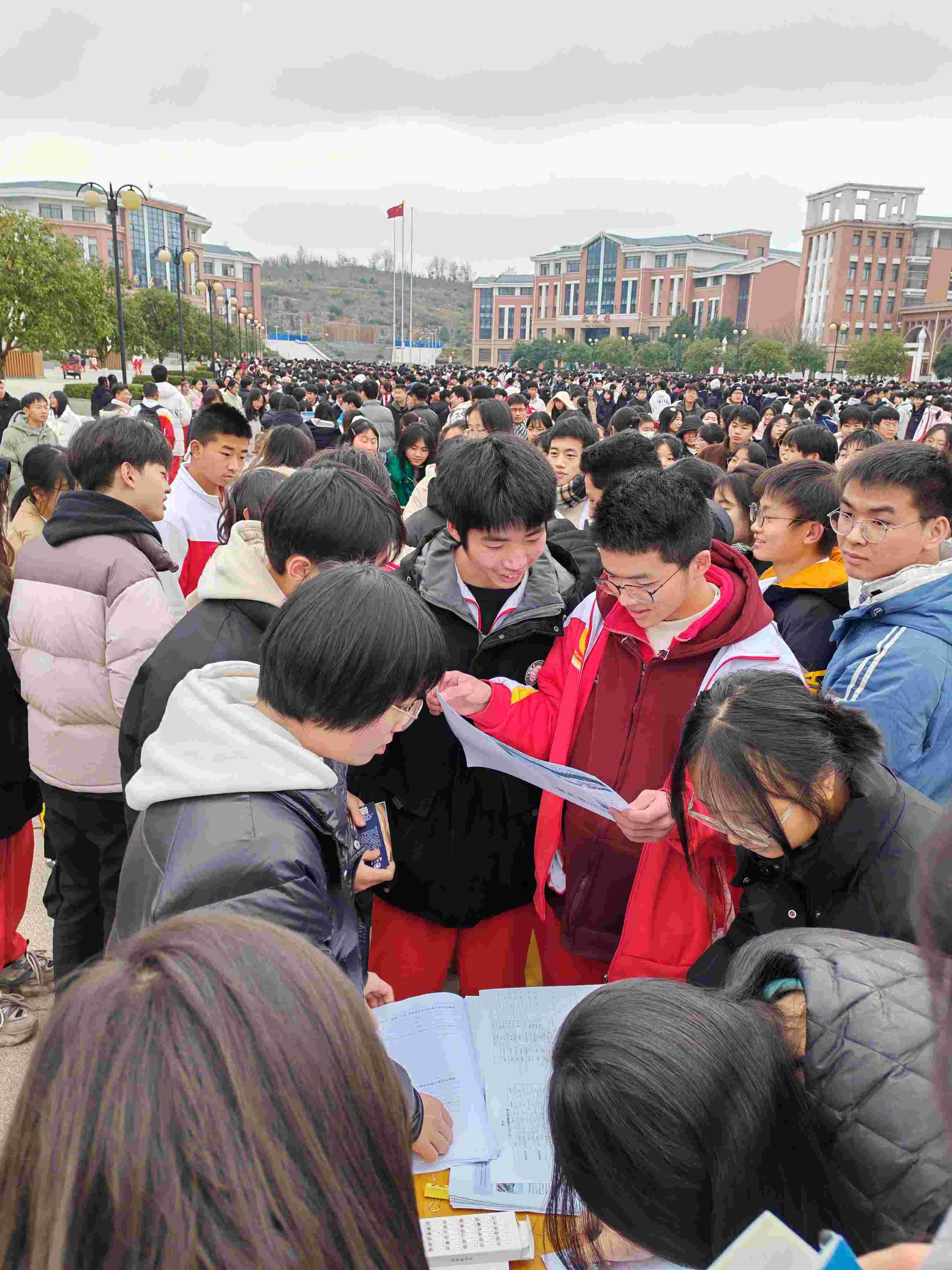 下午三點,活動正式開始。吳丹彤在老師的陪同下參觀了校園,了解了母校的變化和發展。隨后,吳丹彤與王云鵬老師進行了詳細對接,觀看了畢節一中的最新宣傳片,了解了學校在招生和宣傳方面的最新動態。王老師也對吳丹彤的宣講活動提出了寶貴的建議,強調了做好宣傳工作的重要性。下午四點半,全體宣講校友在學術報告廳門口與校長黃世虎、學生發展中心主任周勇以及王云鵬老師等領導合影留念。合影后,吳丹彤前往弘毅廣場參與各學校的攤位宣講,并開始正式的宣講活動。在廣場上,她不僅講解了山東大學的基本情況,還詳細介紹了學校的教育理念、各專業設置以及校園文化等。結合自身的經歷,吳丹彤分享了在山東大學(威海)的學習與生活經歷,她向在場的每位學生講解了高等教育對個人成長的重要性,并鼓勵他們在學業上努力追求卓越,樹立明確的學習目標。她提到,大學不僅是一個學習知識的地方,更是一個發現自我的平臺,讓學生們在不同的學術領域盡情探索和發展。為了更好地了解同學們的需求和對未來的規劃,吳丹彤還設計了一份母校回訪調查問卷,鼓勵同學們積極參與填寫,這不僅為她收集反饋提供了依據,也讓同學們表達出自己的想法和期待。