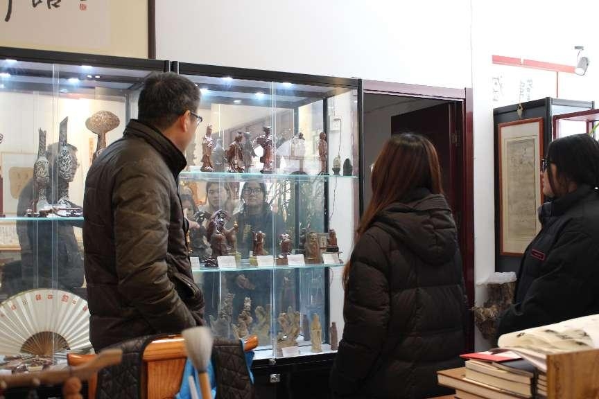 在一件大型楷木如意前,團隊人員駐足良久。這件如意運用浮雕與鏤空雕相結合的技法,主體圖案為龍鳳呈祥。在燈光的映照下,楷木特有的紋理與光澤相互交融,賦予作品溫潤典雅的氣質。據館內講解員介紹,楷木雕刻歷史悠久,可追溯至西漢。在漫長歲月里,實踐團成員了解到它不僅承載著祈福納祥的美好寓意,更與當地民俗文化緊密相連,成為地域文化的重要符號。