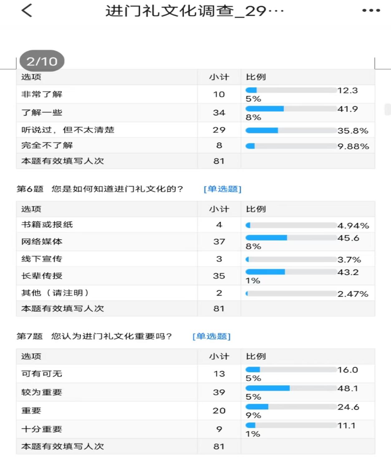 此次調研為深入了解當代社會對門禮文化的認知提供了有力的數據支撐,也為推動中華傳統門禮文化的傳承與發展提供了寶貴思路。實踐隊負責人表示,后續將持續深入研究,通過更多社會實踐活動,助力門禮文化在新時代煥發生機。