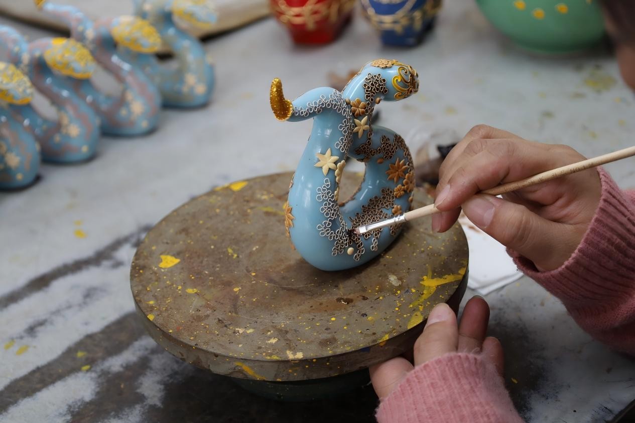 非遺春節,文化新生。作為閩南獨有的傳統技藝,漆線雕技藝走進校園、走進社區,參加非遺展演,赴新春之約。蔡氏漆線雕上架蛇年生肖款作品喜迎新春。淡藍色的蛇形胚體,利用3D建模研發而成,再結合傳統漆線雕工藝進行紋路裝飾。