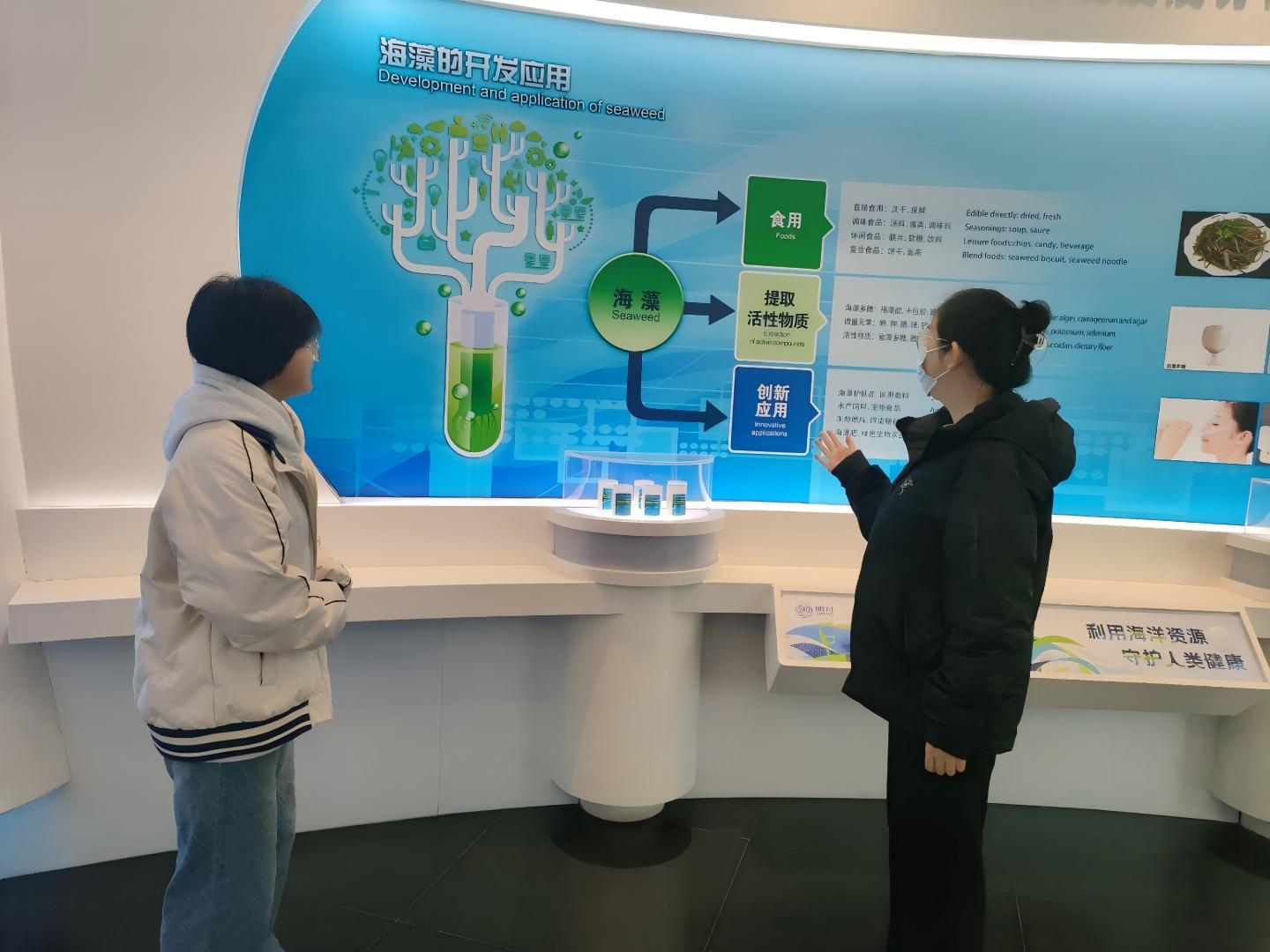 圖為實踐隊員聽工作人員講解海藻的開發利用。鐘千 供圖