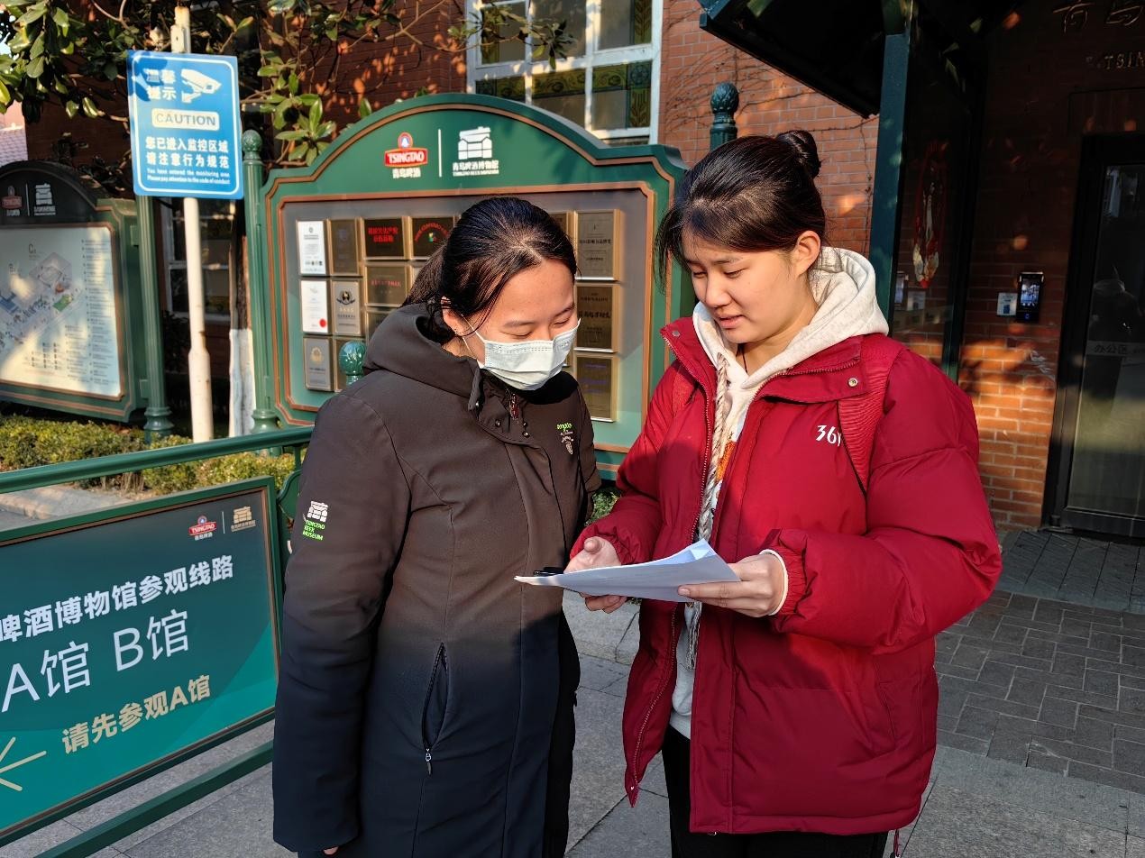 圖5 與工作人員進行訪談交流“青啤近年來推出的‘百年之旅’‘琥珀拉格’等高端產品線,正是基于對消費升級趨勢的數據洞察。”企業市場部經理張女士在交流中提到。這一觀點引發了團隊成員的強烈共鳴。