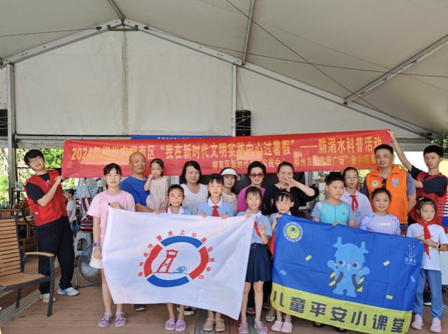 圖為江蘇科技大學海洋學院“暖冬”公益服務實踐團的志愿者在社區開展“兒童平安小課堂”防溺水科普活動并與社區志愿服務隊合影留念。 覃舒桐 供圖。