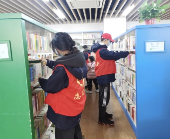 圖為江蘇科技大學海洋學院“暖冬”公益服務實踐團的志愿者在福利院整理書籍。覃舒桐 供圖。