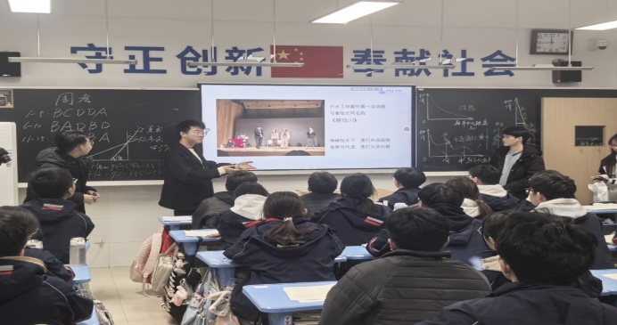伴隨著班主任陳老師的熱情歡迎,宣講拉開帷幕!首先,“豫見連理”實踐團成員王文浩用親切平實的語言,成功使同學們對宣講充滿高漲的熱情與濃厚的興趣,現場氣氛輕松活躍。