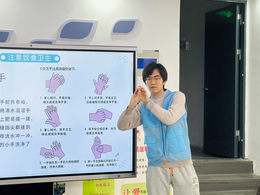 圖為服務隊志愿者教授平安社區小朋友們“六步洗手法”的規范操作。楊福森攝