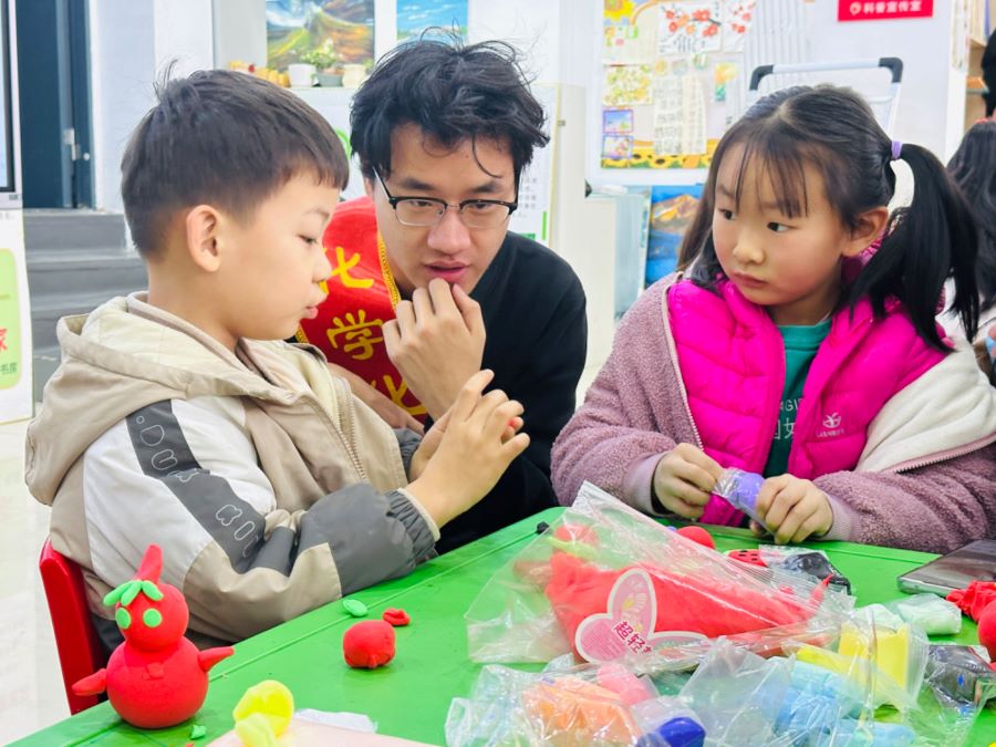 圖為服務隊志愿者在與平安社區小朋友交流手工泥塑的制作方法。楊福森攝