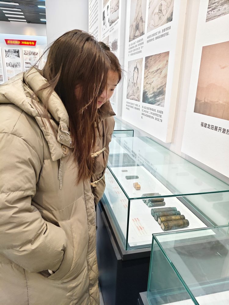 圖為團隊成員懷著無比崇敬的心情,瞻仰杜鳳瑞烈士生前使用過的珍貴作戰(zhàn)用品,流露出對烈士的無限敬仰與緬懷之情。李羚可 供圖