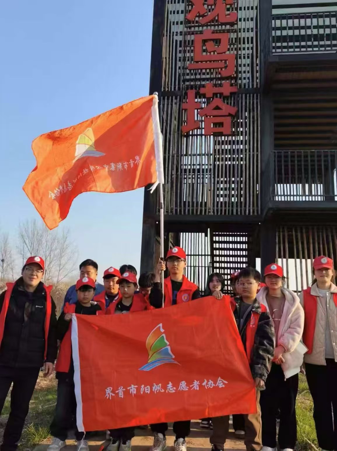 志愿者和學生們在觀鳥臺合影留念(通訊員 榮佩琪攝)