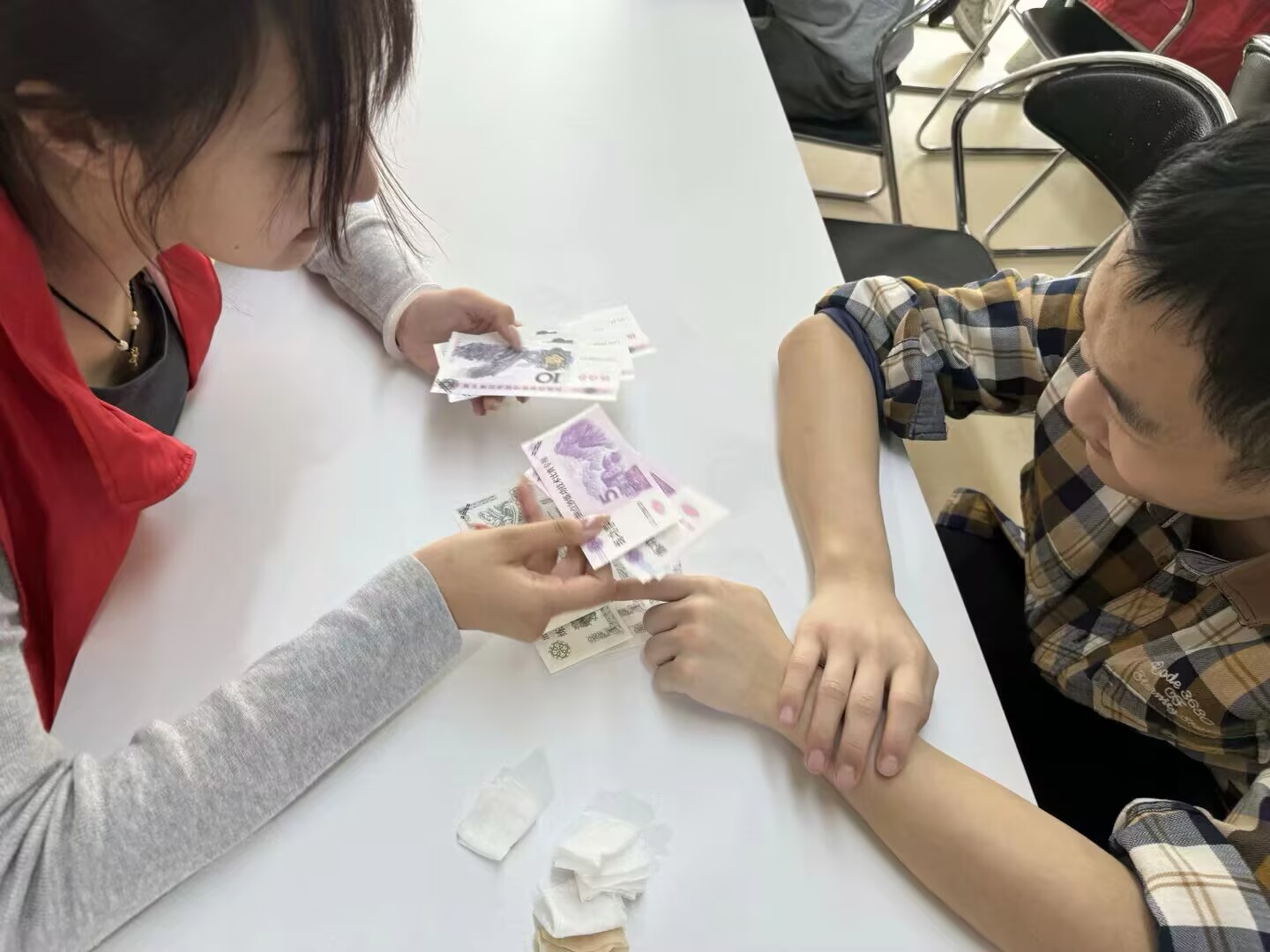 緊接著,志愿者與學員共同開展 “錢幣兌換站” 游戲。活動以兩兩小組對抗的形式展開,出題方快速給出一種取出相應金額紙幣的方式,答題方則需靈活思考,用另一種方式取出等額紙幣。一來一往間,現場氣氛熱烈,將活動推向高潮。這一游戲有效提升了學員們對紙幣的熟練程度,也為后續活動的順利開展奠定了良好基礎。