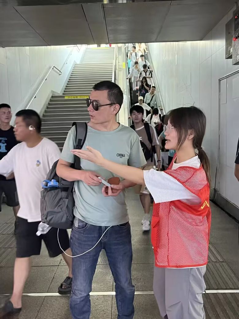 出站口是旅客行程的最后一站,也是城市留給旅客的“第一印象窗口”。在這里,武漢鐵院的學員們化身“城市向導”,為旅客指引出站路線、換乘方式,耐心解答各類問題。面對不同口音、不同需求的旅客,他們始終保持微笑,用通俗易懂的語言讓指引更加清晰。遇到外國旅客時,即便語言溝通存在障礙,學員們也會借助翻譯軟件、手勢等方式,努力幫助對方找到目的地。有位旅客因不熟悉當?shù)亟煌ǎ诔稣究谂腔苍S久。學員主動上前詢問,不僅詳細告知地鐵線路,還貼心地幫其規(guī)劃最優(yōu)換乘方案。旅客離開時連連道謝,這份認可讓學員們感受到,自己的服務不僅便利了旅客的出行,更傳遞著城市的溫度。
