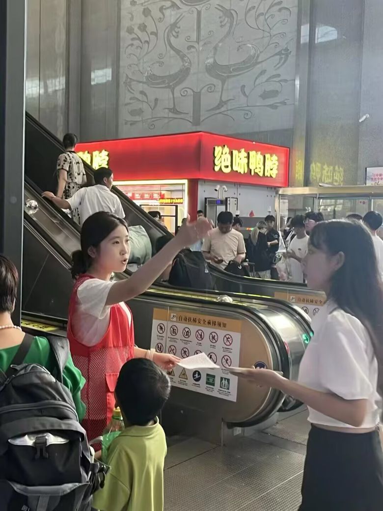 樓梯口的崗位看似平凡,卻承載著重要的安全責任。暑運期間,旅客攜帶的行李繁多,上下樓梯、乘坐電梯時稍有不慎便可能發(fā)生意外。值守在此的學員們時刻保持警惕,目光如炬地觀察著周圍動態(tài)。“請不要奔跑,注意腳下安全”“請有序排隊,不要擁擠”,這樣的提醒每天都要重復上百遍。一次,有位老人在乘坐扶梯時因行李過重突然失衡,學員眼疾手快按下急停按鈕,迅速上前攙扶,確認老人無恙后還幫忙將行李搬至安全區(qū)域。在這個崗位上,學員們深知,每一次及時的提醒、每一個敏捷的動作,都是對旅客安全的堅實守護。