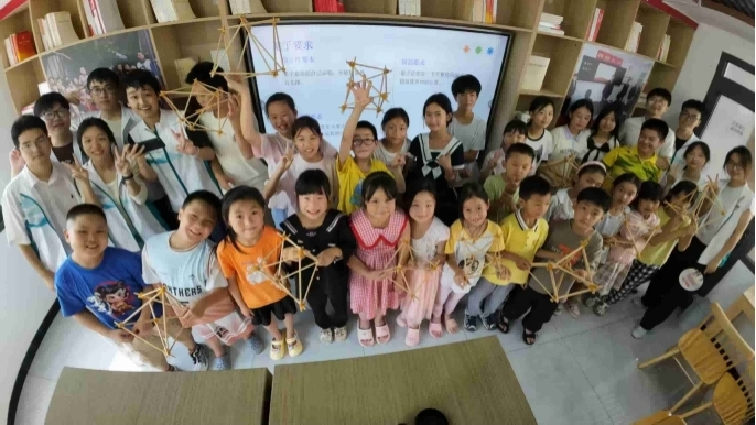 圖為實(shí)踐隊(duì)組織筷子結(jié)構(gòu)模型承載力設(shè)計(jì)比賽。董欣元攝。