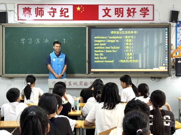 實踐隊成員向寧晉七中的學生們分享英語單詞巧記技巧。教師教育學院暑期實踐隊通訊員 攝