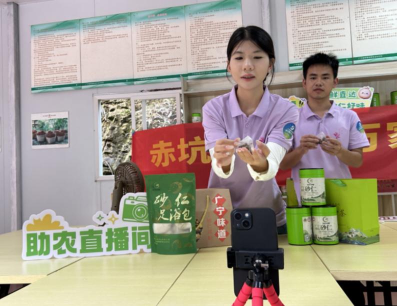 在砂仁產業方面,隊員們參觀種植基地,采訪種植人員,了解到砂仁生長對環境要求苛刻,當地已形成規模化種植格局。服務隊為合作社提出建立砂仁生長AI監測系統、開發區塊鏈溯源平臺、打造“赤坑砂仁”數字IP等賦能計劃,還通過直播助農的方式,為砂仁銷售拓展新渠道。