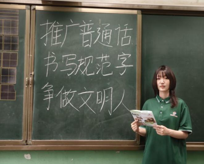 活動現場精心設置了圖文并茂的推普主題展板,內容涵蓋“推廣普通話,書寫規范字,爭做文明人”“語言文字是國家文化的基石”等核心知識。身著墨綠色短袖的文學院隊員們化身為推普小老師,耐心引導孩子們“讀展板”,講解普通話的重要性。圍繞展板內容,還設計了“猜字謎”和“繞口令”挑戰賽。孩子們踴躍參與,或獨自思考,或互相討論,清脆的童聲念出的每一個標準字音和流利句子,都能贏得精美小禮物。在歡聲笑語中,孩子們的語言興趣被點燃,普通話規范意識悄然增強。