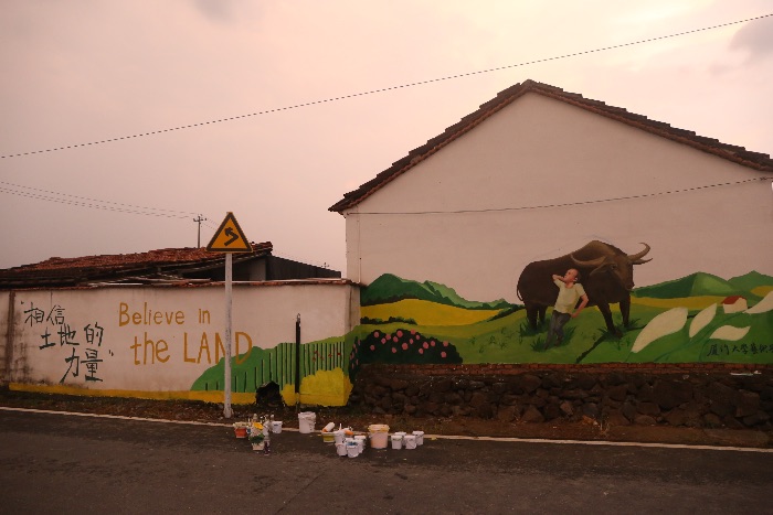 藝術設計組對第二面墻繪進行精修和收尾,最后一日更是全隊成員共同作畫。在日落時分,兩幅大型主題墻繪作品正式落成!斑駁的老墻煥然一新,成為漕橋村亮麗的新文化地標。隊員們還隨機對在墻繪前打卡的游客進行了訪談,直觀了解游客對墻繪的審美感受和文化認同度。