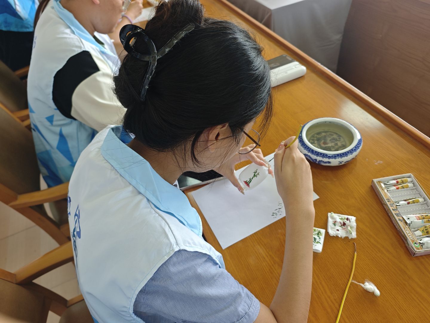 實踐尾聲,我們肩負(fù)起文化傳播的使命。上午走進張店區(qū)鐵路小學(xué),為小學(xué)生們帶來了一場生動的琉璃與魯派內(nèi)畫文化宣講。我們利用圖片深入淺出地講解琉璃的“火的藝術(shù)”特性和內(nèi)畫的“壺中天地”之妙。最受歡迎的環(huán)節(jié)是帶領(lǐng)孩子們體驗內(nèi)畫基礎(chǔ)筆法。盡管筆觸稚嫩,但孩子們專注的眼神和完成“作品”后最純粹的笑容讓我們看到了文化種子在幼小心田萌芽的希望。下午,實踐隊深入周邊社區(qū),設(shè)立宣傳點,通過實物觀摩、互動問答和隨機采訪等形式,向居民普及琉璃知識,了解普通民眾對本土非遺文化的認(rèn)知現(xiàn)狀與期待。許多老年居民對傳統(tǒng)琉璃器皿充滿感情,而年輕一代則更關(guān)注其藝術(shù)價值與創(chuàng)新應(yīng)用,這提示我們文化傳播需精準(zhǔn)對接不同群體的需求和興趣點。