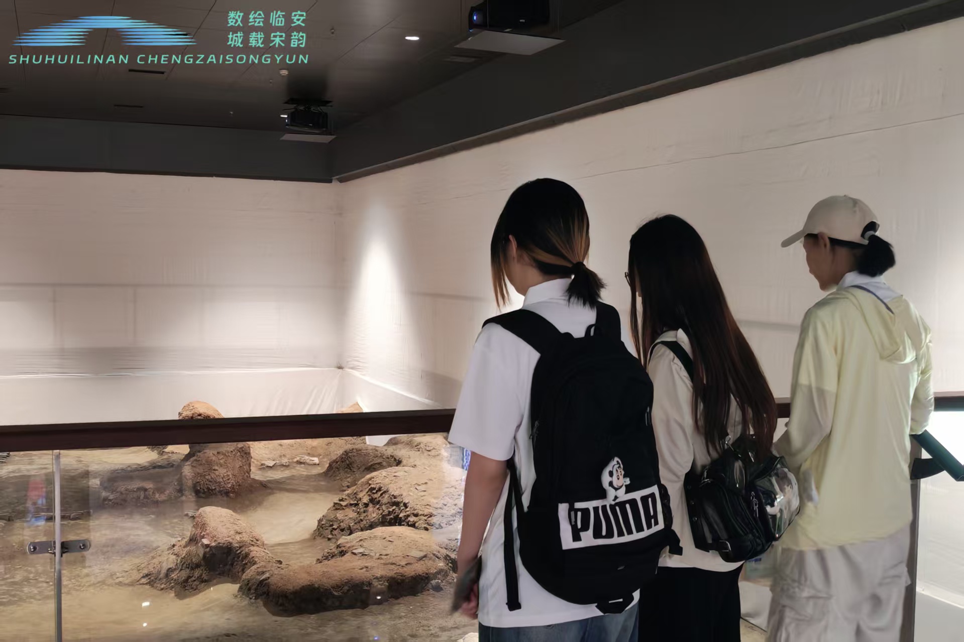 在杭州方志館的史料印證后,德壽宮遺址帶給隊員們前所未有的震撼。站在重華殿遺址區,戴上VR設備,工字殿瞬間在眼前拔地而起,飛檐斗拱,簡約而氣韻生動。“以前看古建復原圖沒感覺,但VR讓我‘走’進去了!宋代那種‘少即是多’的建筑美學,變得無比直觀和震撼。”建筑學背景的小黃興奮不已。慈福宮遺址則上演著現實與虛幻的協奏曲,全息投影讓殘存的基石上“生長”出完整的宮殿輪廓。“科技讓遺址不再冰冷,它賦予了歷史場景以鮮活的生命力,仿佛能聽到當年宮苑里的細語。”隊員們在文創區流連忘返,那些融合傳統元素與現代設計的文創產品,也點燃了他們后期設計宋韻文創的靈感火花。“原來,古老的文化可以如此時尚地表達。”