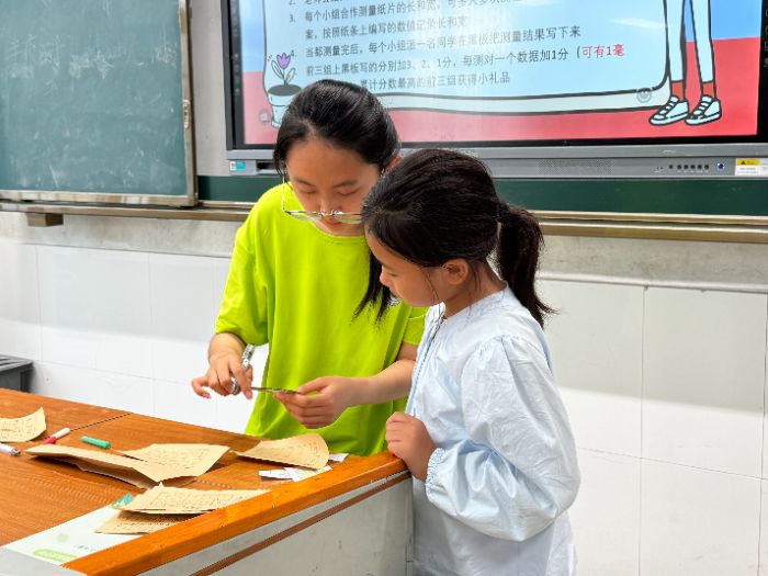 “測量工具制作與度量方法”課上,志愿者回溯從“結繩記事”到“激光測距”的度量發展史,并指導學生使用硬紙板條制作簡易刻度尺,反復測量、校驗誤差,以尺為媒丈量數學與生活的距離;“菜畦測繪與面積計算”課上,志愿者傳授“化整為零”法,將不規則菜畦拆解為規則矩形測算面積,學生們學以致用,手持卷尺穿梭田間,測量數據、規劃種植間距,在實踐中鞏固知識;“農場情境數理應用”課上,學生化身“農場主”,運用畫圖法、假設法等破解雞兔同籠、牛吃草、飼料分配等問題,增進了數學應用能力,深刻領悟到數學知識在勞動實踐中的價值。