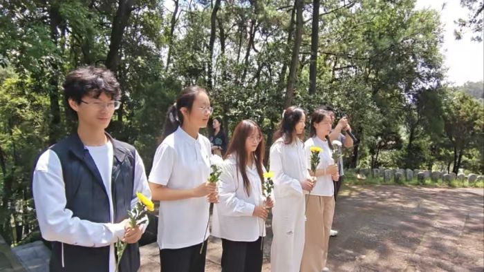 在了解滇西抗戰(zhàn)的歷史背景下,團(tuán)隊(duì)成員走進(jìn)國(guó)殤墓園,錄制線上微團(tuán)課,用普通話講述滇西抗戰(zhàn)的故事。